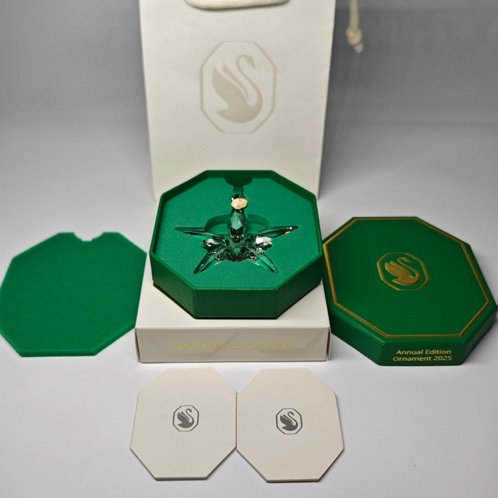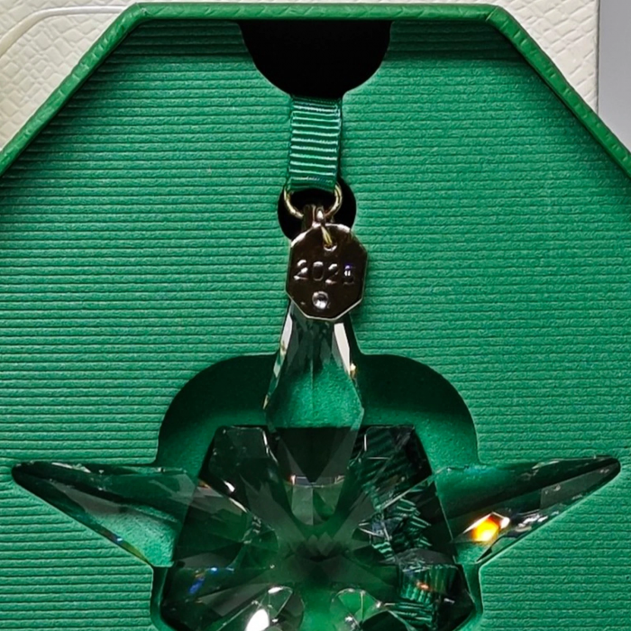 2. The star shaped design is suspended on a green satin strip with champagne gold trim, and the 170 precisely cut facets of refracted light perfectly interpret Swarovski's minimalist aesthetics and exquisite craftsmanship in complexity.