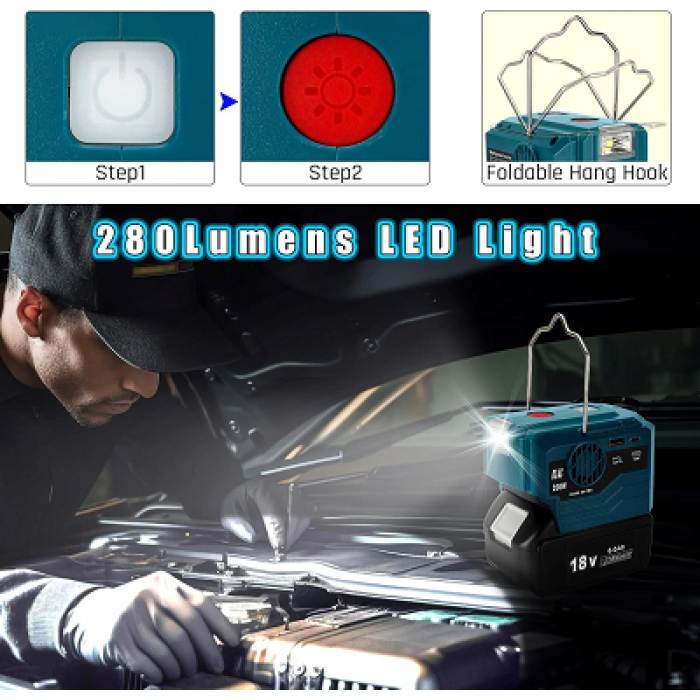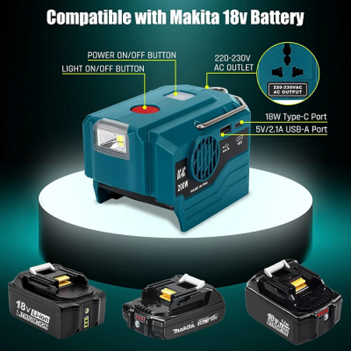 200W Power Inverter for Makita 18v Battery,DC 18V to AC 220-230V Battery Adapter with USB-A & Type-C Port,280LM LED Light for Outdoor Picnic Camping Emergency(Tool only, Battery not incldued)